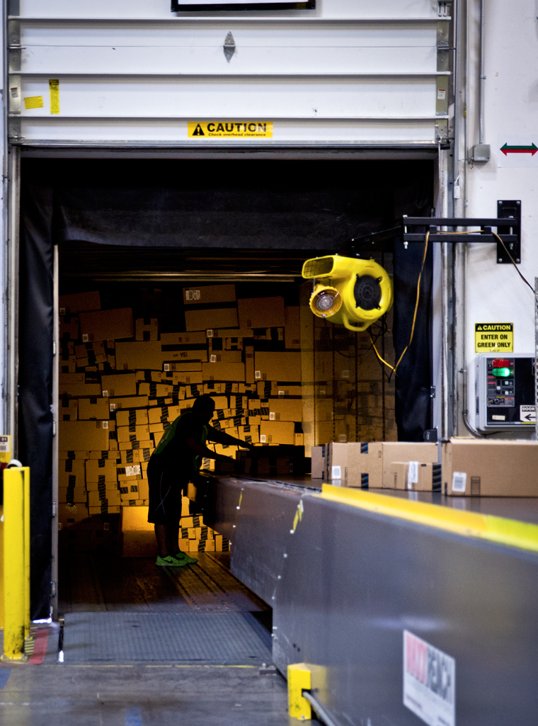 一旦在包装车间被打包好,这些纸箱会来到一个传送带上。在传送带的上方,一个标签机将会把这些纸箱对应的物流信息单打印出来并贴在纸箱上,快速、程式,同样高效、同样无情。然后,这些纸箱将被转移到装卸坞上,准备装入一辆又一辆的亚马逊物流卡车中。