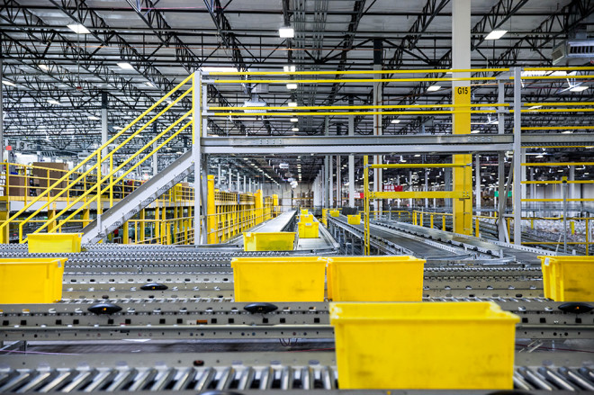 一辆一辆的卡车停靠在装卸坞,一箱又一箱的货品被卸下。亚马逊的工人们将这些货品拆箱、扫描,然后按单品放置到不同的黄色塑料箱中。然后输送机和传送带将这些塑料箱运送到运营中心中的不同地方。